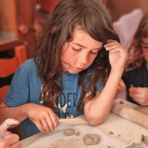 Grounded and slow. Children work with clay, shaping, building, getting beautifully messy. They learn what it feels like to make something from nothing, to sit with a material that doesn’t hurry them.