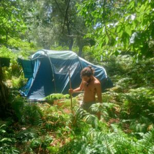 Skiathos in summer is reliably sunny, but the forest has its own weather. We don't have indoor spaces, this is genuinely outdoor living. If it rains, we protect the tents with tarps and keep the rhythm going. If it really pours, we gather in the caravans and the container. It's cosy, a little improvised, and honestly it tends to become a favourite memory.