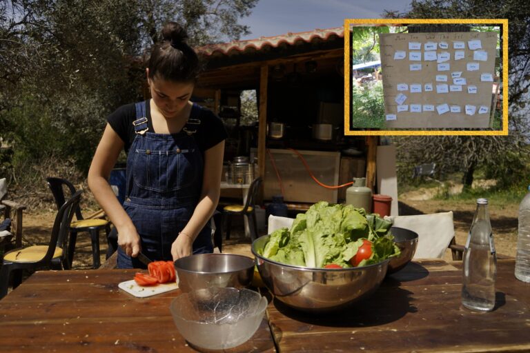 Life here follows a gentle rhythm shaped by nature and by the people who share the space. We start the day with a morning meeting at 9:00 (sometimes earlier or later, depending on Ilektra’s work schedule). Together, we look at our project board — the weekly and monthly tasks — and everyone chooses what they feel like working on.
