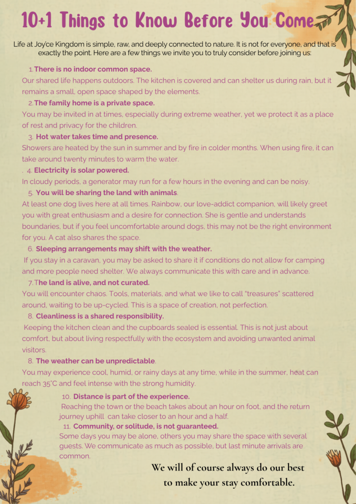 Life at Joy’ce Kingdom is simple, raw, and deeply connected to nature. It is not for everyone, and that is exactly the point. Here are a few things we invite you to truly consider before joining us: